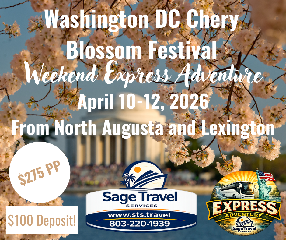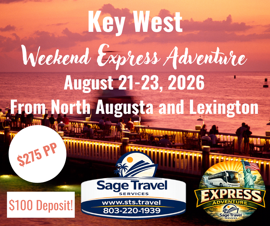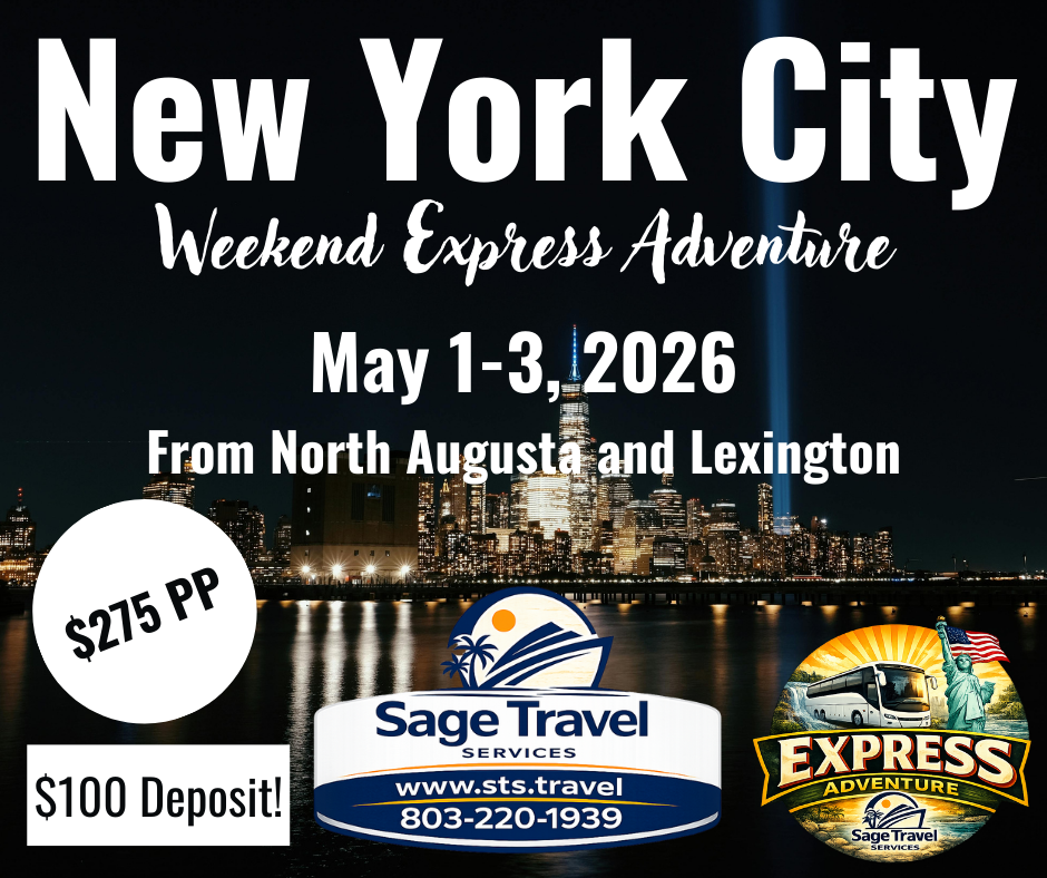 We depart Friday evening, travel overnight, and arrive Saturday morning. You’ll enjoy all day Saturday on your own to explore, shop, dine, or sightsee. Saturday night or Sunday morning, we head back home, arriving home sometime on Sunday.